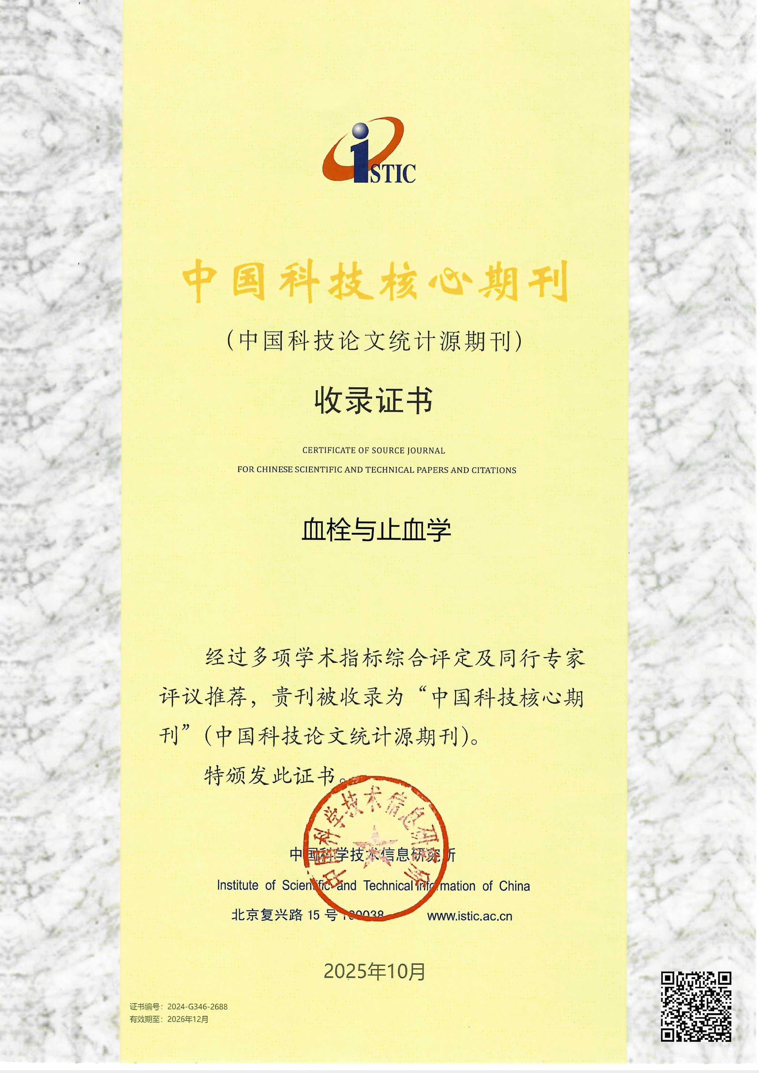 2025年10月30日,在北京五洲大酒店召开的“中国科技论文统计结果发布会”上,2025年版《中国科技期刊引证报告核心版》正式发布,《血栓与止血学》成功入选2025年版中国科技核心期刊。经科技部中国科学技术信息研究所组织的多项学术指标综合评定、函审专家评审及线上答辩专家终审评议,《血栓与止血学》杂志成功入选中国科技核心期刊(中国科技论文统计源期刊),标志着期刊学术水平与行业影响力获得权威认可。